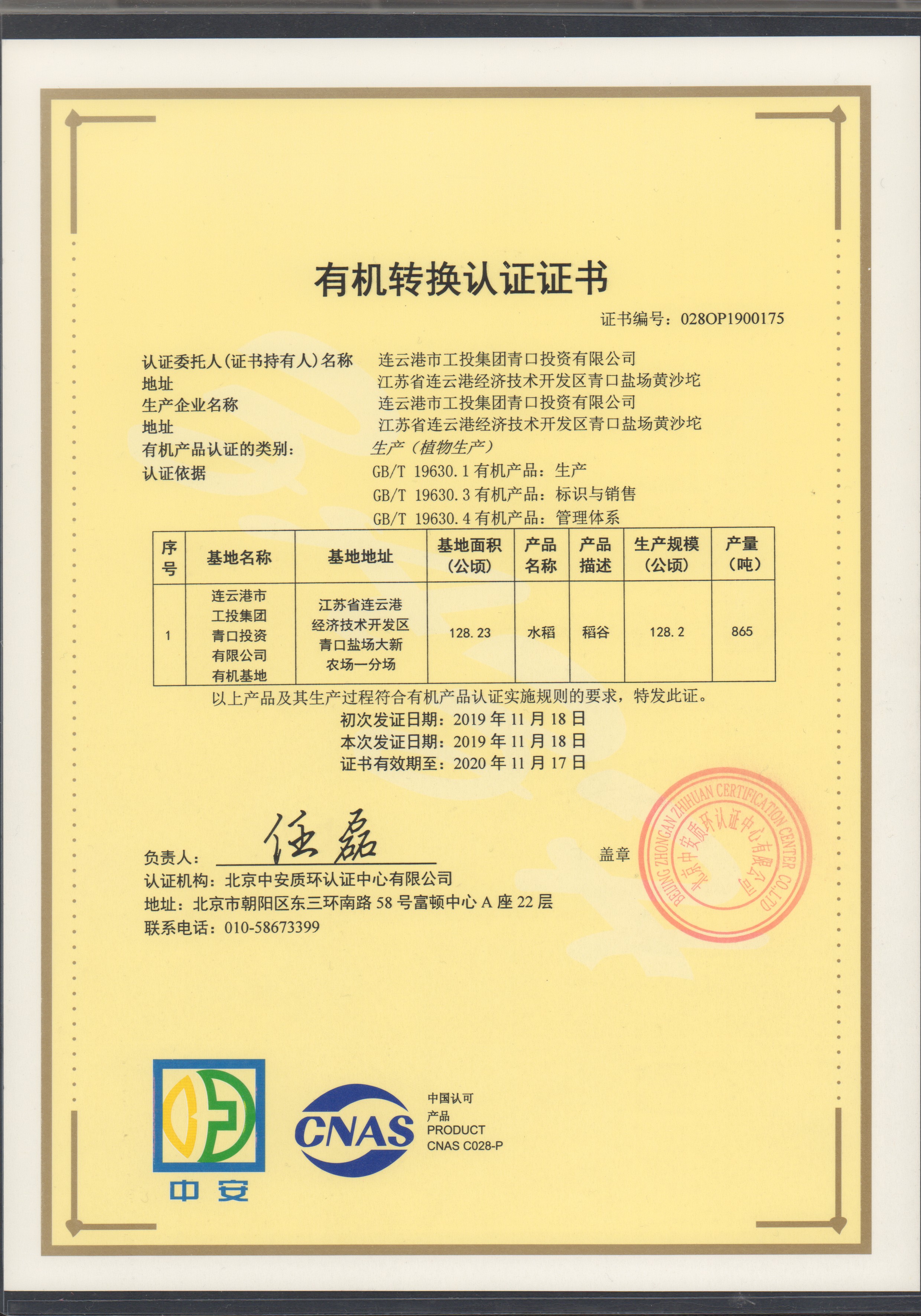 11月25日上午,青口投資公司種植的“南粳9108”有機(jī)大米經(jīng)過(guò)嚴(yán)格的檢測(cè)和審核,榮獲北京中安質(zhì)環(huán)認(rèn)證中心頒發(fā)的有機(jī)轉(zhuǎn)換認(rèn)證證書。