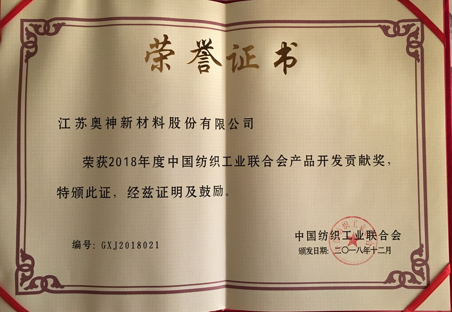 近日,在北京召開的2018年中國(guó)紡織創(chuàng)新年會(huì)上,江蘇奧神新材料股份有限公司獲得中國(guó)紡織工業(yè)聯(lián)合會(huì)頒發(fā)的“2018年度中國(guó)紡織工業(yè)聯(lián)合會(huì)產(chǎn)品開發(fā)貢獻(xiàn)獎(jiǎng)”榮譽(yù)稱號(hào)。