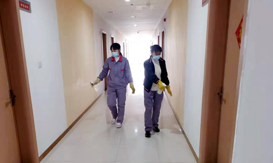 干凈整潔的辦公樓、宿舍樓里飄著淡淡的消毒水味道,清瘦干練的保潔員任禮勤正在仔細地打掃著樓道。5號疫情突發(fā)之時她正好當班,根據以往疫情經驗,她果斷地把一直照料著的年邁母親安排給了大哥,此后便堅守在工作崗位上。疫情防控期間的工作量增加了不少,每天她和同事們分片作業(yè),在認真做好各自清潔區(qū)每日兩次的保潔、消毒工作的同時,還要負責就餐人員一日三餐的登記、測量體溫等工作。每天從早上7點開始,5位保潔員的身影便忙碌在公司的門廳、餐廳、樓道、電梯等場所,這一忙常常要到晚上6點多。“請您量下體溫”“今天你做核檢了嗎”,這些溫馨的話語幾乎成了她們對大家的問候語。