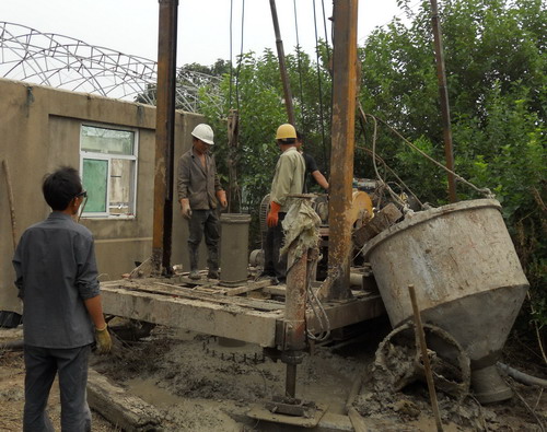 圖為管港變電所增容改造工程的鐵塔塔基灌砼施工現(xiàn)場