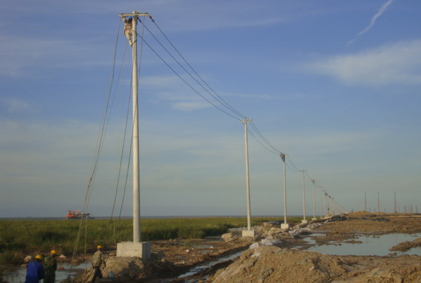 連云新城三期供電線路緊貼海堤邊。受海堤建設(shè)進度和海風海潮的影響,低矮的壩堤經(jīng)常被風刮起的海浪浸頂,石塊突起,洼水漣漪,淤泥纏足,堤邊路面凹凸不平,道路僅限一輛車通行,擁擠不堪,工程施工難度極大。為提升速度,加快進度,臺北供電所克服困難,緊鑼密鼓地展開工作,以期早日完工。現(xiàn)場勘察地形地貌,了解潮汐運動規(guī)律,制定施工計劃,設(shè)計措施方案,組織人力,采購材料,投入施工。施工人員采用彈性工作時間,利用落潮時機,搶運電桿,及時立桿和裝配。職工們發(fā)揚不怕苦,不畏難的精神,不懼海風吹臉、海水浸衣,爬上距離海平面二十多米仿佛搖擺不定的高桿,懸在空中一絲不茍地操作,保障了工程的全面竣工。