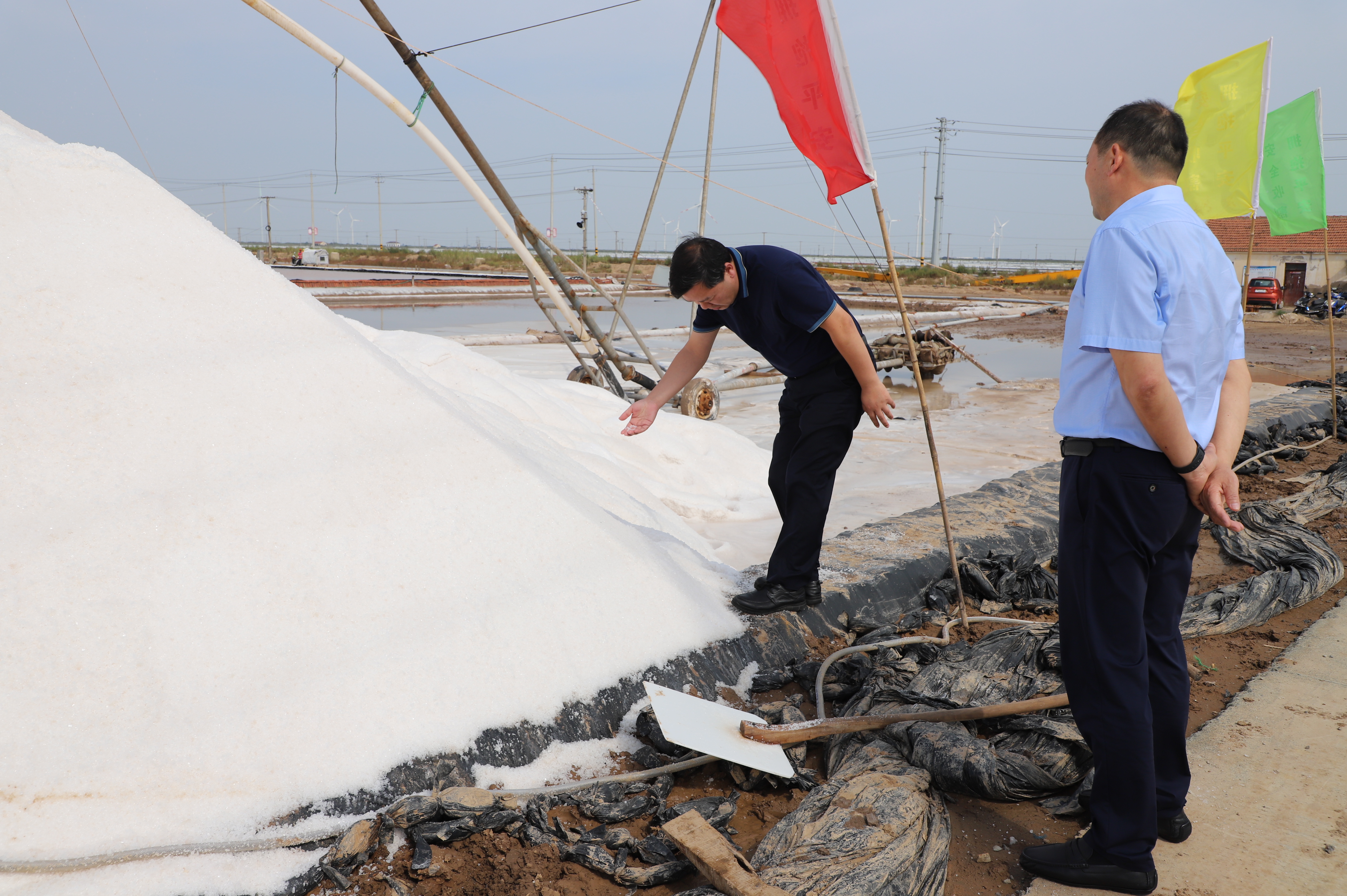 調(diào)研組一行先到新河十三班參觀現(xiàn)場(chǎng)扒鹽,李國文董事長向調(diào)研組一行介紹了目前日曬制鹽公司采用的帶鹵扒鹽技術(shù),并就目前鹽業(yè)生產(chǎn)、運(yùn)輸、銷售等情況進(jìn)行了簡單的介紹。