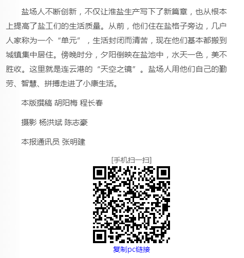 鹽場人不斷創(chuàng)新,不僅讓淮鹽生產寫下了新篇章,也從根本上提高了鹽工們的生活質量。從前,他們住在鹽格子旁邊,幾戶人家稱為一個“單元”,生活封閉而清苦,現在他們基本都搬到城鎮(zhèn)集中居住。傍晚時分,夕陽倒映在鹽池中,水天一色,美不勝收。這里就是連云港的“天空之鏡”。鹽場人用他們自己的勤勞、智慧、拼搏走進了小康生活。