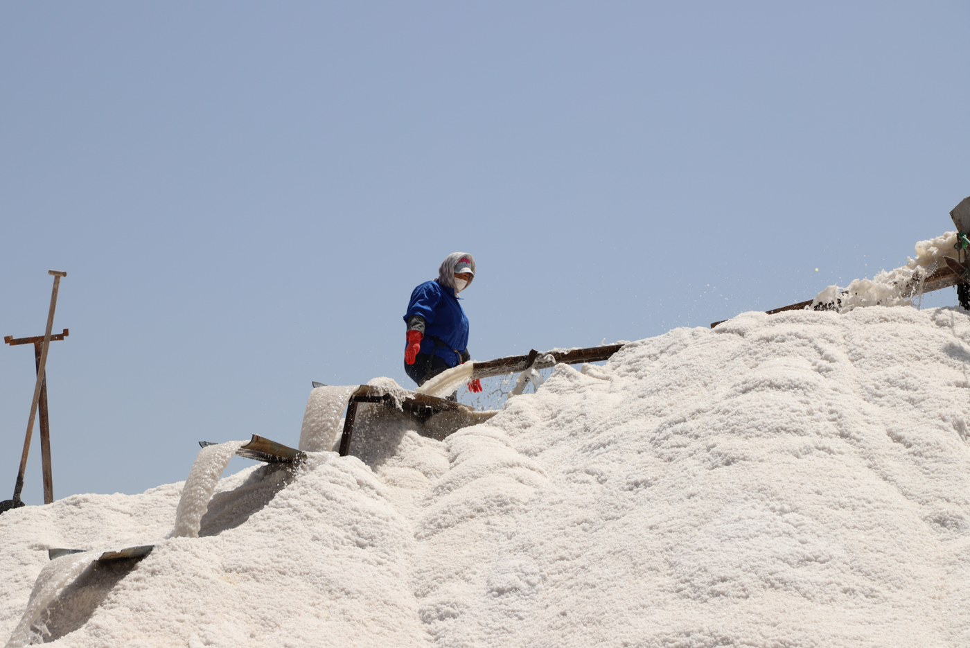 在新河十一班,扒鹽工作正在緊張的進(jìn)行之中,兩名員工在鹽廩上揮舞著木鍬,搬送著淌鹽的導(dǎo)流板做鹽廩,扒鹽員工跟時間賽跑,24小時不停機(jī)3班倒開機(jī)扒鹽,緊緊抓住當(dāng)前生產(chǎn)經(jīng)營的黃金季節(jié),搶抓扒鹽進(jìn)度,堅決實現(xiàn)時間任務(wù)雙過半。