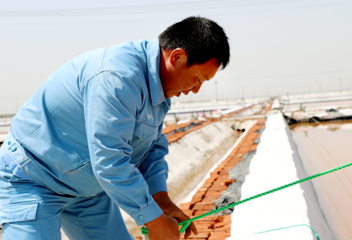 在新河的八班,員工有的在補(bǔ)塑料布,有的在疏通排水溝道,整理繩索,也是忙的熱火朝天。為了抓好二季度工作,八班以生產(chǎn)合格原料食用海鹽為目標(biāo),緊抓有利天時,進(jìn)一步創(chuàng)新海礦鹵勾兌制鹽工藝,細(xì)化工作措施,責(zé)任到人,著力提升原鹽質(zhì)量和產(chǎn)量,目前已生產(chǎn)海水鹽4000噸。