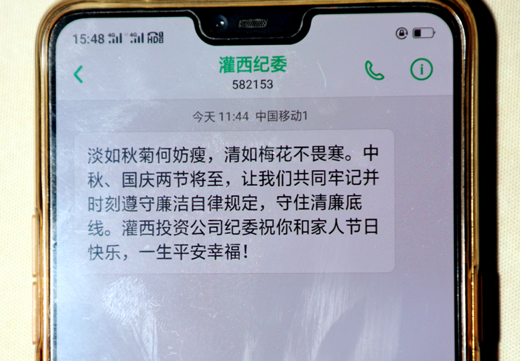 群發(fā)一條廉政提醒短信。以“灌西紀(jì)委”名義向全公司黨員干部普發(fā)“廉政短信”。向黨員領(lǐng)導(dǎo)發(fā)送廉政短信‘拉袖子 、敲警鐘’,以提醒黨員干部“嚴(yán)格執(zhí)行廉潔從政各項(xiàng)規(guī)定,‘反四風(fēng)’、樹新風(fēng),廉潔文明過佳節(jié)”,不僅提醒黨員干部做好廉潔帶頭人,更重要的是提醒廣大領(lǐng)導(dǎo)干部要牢記黨風(fēng)廉政建設(shè)兩個(gè)責(zé)任,在落實(shí)責(zé)任上要有主動(dòng)擔(dān)當(dāng)!