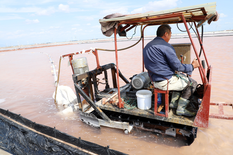 筆者在走訪時(shí)看到,在新河制鹽分公司10班的鹽池內(nèi),一臺輕型自吸式電動(dòng)履帶“T30”正在進(jìn)行帶鹵扒鹽,大池道上抽鹽機(jī)泵的轟鳴聲回蕩在鹽灘上,不遠(yuǎn)處另外幾個(gè)扒鹽機(jī)組也在不停的忙碌著。