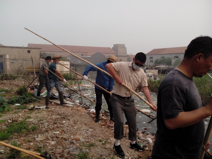 大家早上7點集合后到所在負(fù)責(zé)片區(qū):化工區(qū)家屬區(qū)北面的河邊,用耙子打撈河中垃圾。大家不顧高溫天氣、垃圾長期在河中腐蝕的異味,用大耙撈,小耙拉,將河中的垃圾運上來。河中懸浮生長的雜草最難清理,大家齊心協(xié)力,用木筏撐著,找繩子拉,經(jīng)過一上午的忙碌,垃圾被清理了,河道暢通了,為居民創(chuàng)造了整潔的環(huán)境,更為雨季到來時河道的排淡能力發(fā)揮了較大的作用。