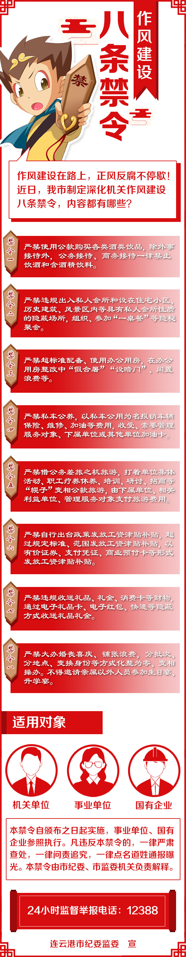 本禁令自頒布之日起實(shí)施,事業(yè)單位、國(guó)有企業(yè)參照?qǐng)?zhí)行。凡違反本禁令的,一律嚴(yán)肅查處,一律問(wèn)責(zé)追究,一律點(diǎn)名道姓通報(bào)曝光。本禁令由市紀(jì)委、市監(jiān)委機(jī)關(guān)負(fù)責(zé)解釋。24小時(shí)監(jiān)督舉報(bào)電話:12388。