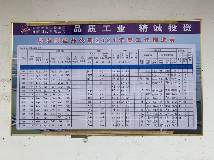 張貼二季度工作推進表,清晰的反映出目前的原鹽產(chǎn)量、質(zhì)量、單耗、以及春季扒鹽情況。分公司經(jīng)理程龍要求各個片區(qū)負責(zé)人按照表上反映的數(shù)據(jù),查漏補缺,強化生產(chǎn)工作。在提高單產(chǎn)、降低單耗上下功夫,強化“三雨操作”加強結(jié)晶管理,嚴格除硫生產(chǎn)工藝,充分利用粉鹽化鹵,下馬格、副廩基等有效面積窮制鹵水,最大限度地降低鹵耗,提高單產(chǎn)加快扒鹽進度強化扒鹽產(chǎn)量保證安全工作