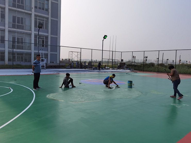 灌西籃球場總面積約510平米,附屬球場地面600平米,外圍護(hù)欄高3米。項(xiàng)目圍繞關(guān)鍵節(jié)點(diǎn)及重難點(diǎn),強(qiáng)化施工組織,統(tǒng)籌施工進(jìn)展。籃球場地面露天暴曬,溫度極高,仿佛蒸籠一般。施工人員在進(jìn)行鑿地、涂漆時(shí),僅幾分鐘的功夫,衣服從里到外被汗水浸濕,隨時(shí)有中暑的可能性,項(xiàng)目組把責(zé)任明確到個(gè)人,開展班前安全教育活動(dòng),保證施工安全。施工單位南翼工程公司負(fù)責(zé)人錢明偉克服人員緊缺,工期緊迫等問題,頂著高溫,始終奮戰(zhàn)在工程項(xiàng)目第一線。