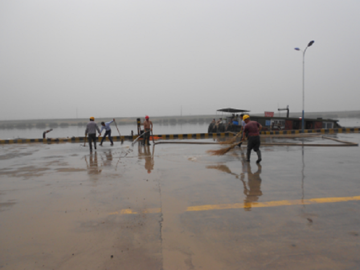 近期由于五灌河水位下降,給停靠碼頭的船只帶來(lái)了很大的安全隱患于是公司決定對(duì)碼頭岸線的河道進(jìn)行一次清淤工作,在清淤的運(yùn)輸過(guò)程中使碼頭作業(yè)區(qū)一片狼跡,為了不影響宏港石化的PPA噸袋的吊裝業(yè)務(wù),6月11日上午公司班子成員主動(dòng)放棄休息日與上班工人一道對(duì)碼頭作業(yè)區(qū)進(jìn)行清理,他們有的用水槍沖,有的用掃帚掃,經(jīng)過(guò)二個(gè)多小時(shí)的奮戰(zhàn),作業(yè)區(qū)場(chǎng)地上渙然一新。(宵洋葛高平)