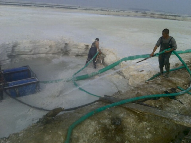 近日來,連續(xù)高溫酷暑天氣對日曬制鹽員工提出了生理挑戰(zhàn),新河制鹽廣大員工直面高溫,不畏酷暑,積極做好除硫工作,保證原鹽質量。圖為除硫現場操作手緊握高壓水槍,對硫酸鈣沉淀區(qū)進行沖刷。(新河制鹽 邱利民)