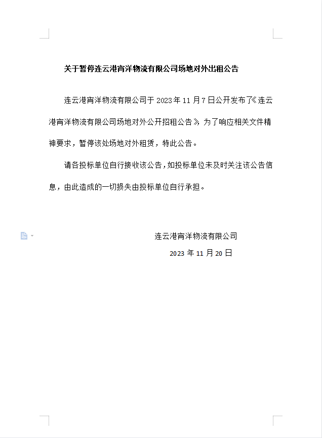 關于暫停連云港宵洋物流有限公司場地對外出租公告