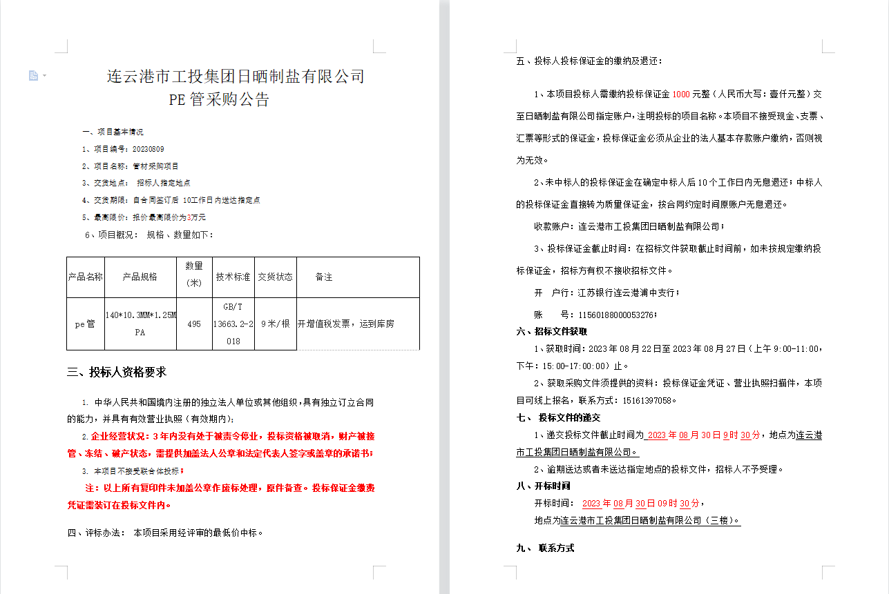 連云港市工投集團(tuán)日曬制鹽有限公司PE管采購(gòu)公告