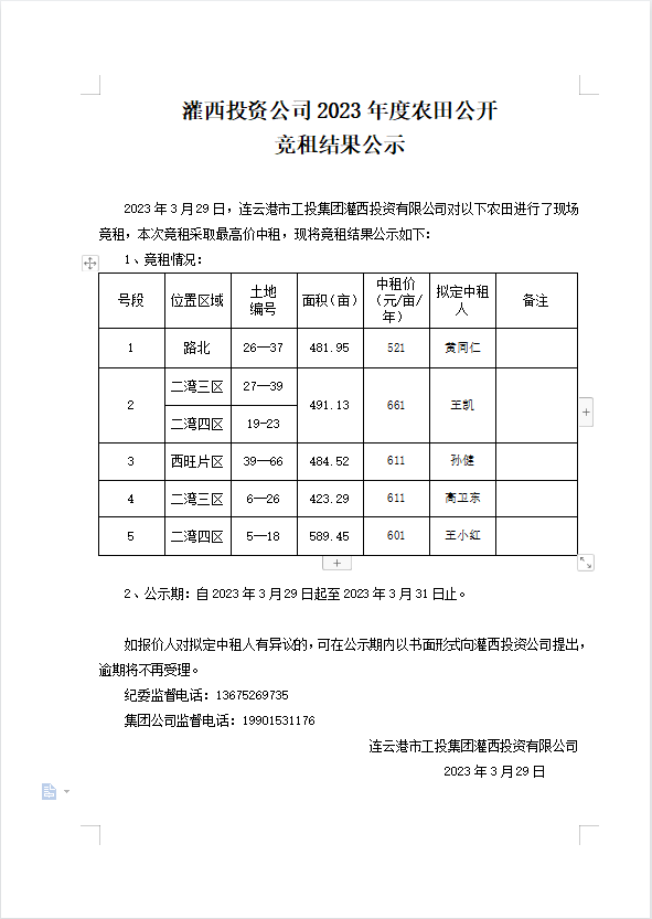 灌西投資公司2023年度農(nóng)田公開 競租結果公示