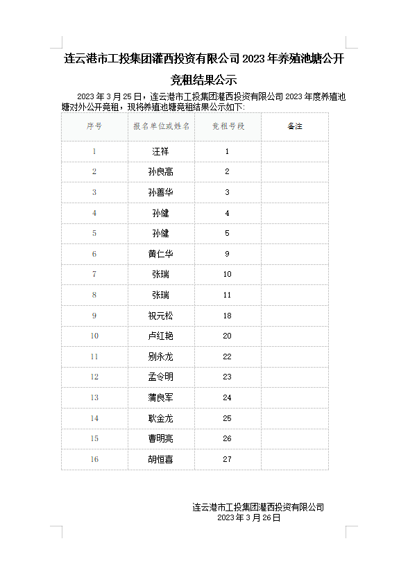 連云港市工投集團灌西投資有限公司2023年養(yǎng)殖池塘公開競租結果公示