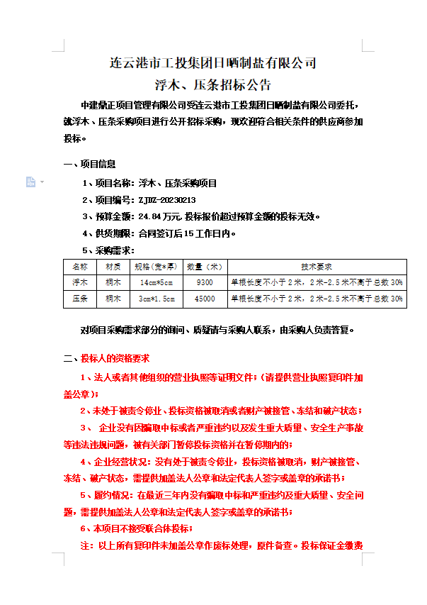 連云港市工投集團日曬制鹽有限公司浮木、壓條招標(biāo)公告