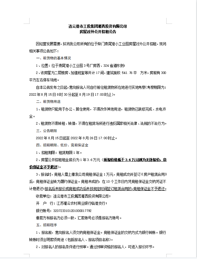 連云港市工投集團(tuán)灌西投資有限公司房屋對外公開招租公告