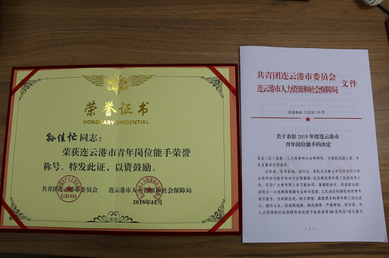 格斯達(dá)擔(dān)保公司業(yè)務(wù)一部副經(jīng)理、贛榆分部副經(jīng)理孫佳忙同志,榮獲2018年度連云港市“青年崗位能手”榮譽(yù)稱號(hào)。