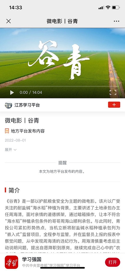 近日,由連云港市工投集團(tuán)青口投資公司自編自演的微電影《谷青》入選學(xué)習(xí)強(qiáng)國---江蘇學(xué)習(xí)平臺。