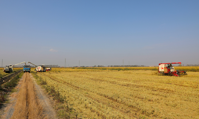 10月23日上午,在青口公司大新農場萬畝農田里,大片水稻已經成熟,沉甸甸的稻穗隨風搖曳。新品種試種示范田里收割機往來馳騁,拉開了秋收的序幕。