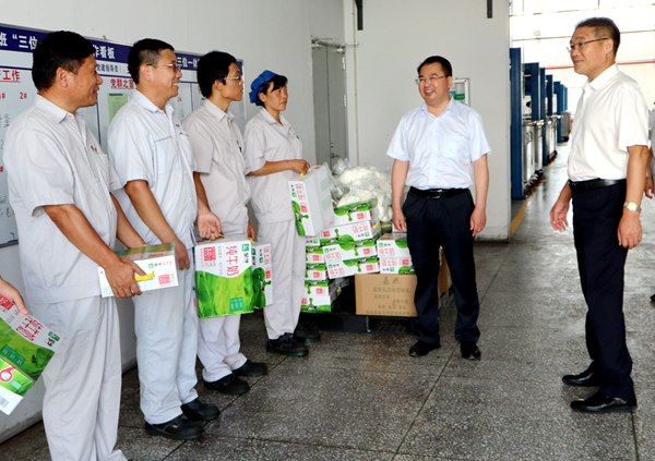 8月1日上午,集團公司黨委副書記戴鴻鳴、工會主席劉承志來我公司慰問生產(chǎn)一線員工,為辛勤工作的員工送來牛奶、綠豆等防暑降溫慰問品。公司黨支部書記、副董事長鄒德兵,總經(jīng)理韓立新等多位領(lǐng)導陪同。