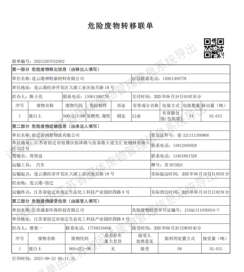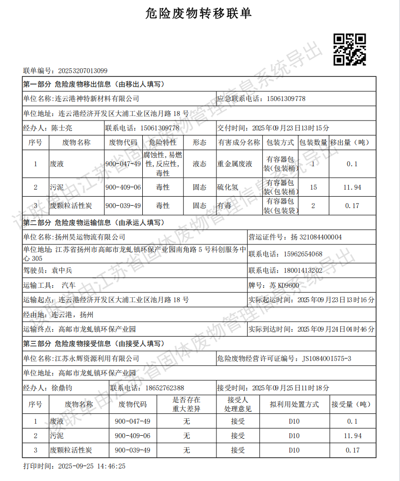 神特公司2025年第三季度危廢處置情況公示