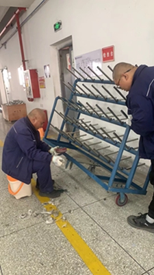 維修臺車時,我當起了孫師傅的下手,一邊將臺車穩(wěn)住不能傾倒,一邊看著孫師傅卸下每個車輪子并進行仔細清理,不怕臟、不怕累,毫無怨言,一絲不茍,動作利落,手法嫻熟,親身直面他的高效率和專業(yè)水平。他還對我詳細解說,讓我理解每個步驟的重要性和關鍵點。我們蔣姐也過來幫忙,不停的清掃臺車上清理出來的垃圾……