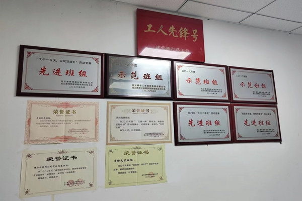 走進(jìn)質(zhì)檢辦公室,首先映入眼簾的就是這面榮譽(yù)墻,上面有近年來集團(tuán)頒發(fā)的“示范班組”和公司授予的各種榮譽(yù),還有一塊金字招牌,就是市總工會(huì)頒發(fā)的“工人先鋒號(hào)”。