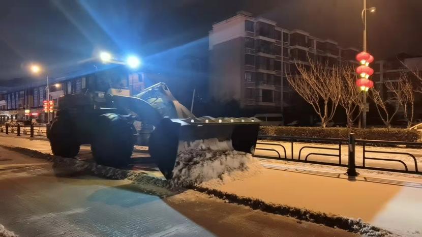當(dāng)晚,按照“即下即清、先通后凈、保障通行”的清雪除冰原則,在統(tǒng)一調(diào)度下,一臺(tái)臺(tái)清雪設(shè)備有序穿行于道路上,撒布機(jī)打頭陣,推雪板車緊隨其后,將路面積雪進(jìn)行打通,地上的雪從前向后逐次被清雪車輛推向道路邊緣。隨后,由人工加以配合,在人機(jī)結(jié)合方式下,冰雪被裝到車上清運(yùn)走。
