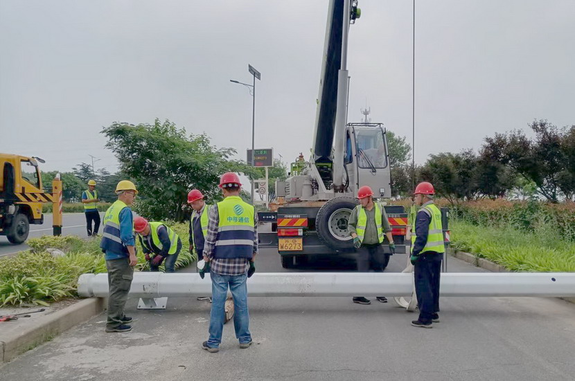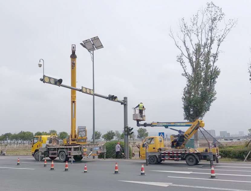 隨后,筆者一行,頂著烈日,驅(qū)車(chē)前往翔立分公司市政工程現(xiàn)場(chǎng),在封閉的道路內(nèi),翔立公司一群黃馬甲戰(zhàn)士,正頂著烈日在緊張的進(jìn)行交通監(jiān)控探頭安裝工作。據(jù)了解他們也是5點(diǎn)多種就到崗位上來(lái)了。經(jīng)理喬以成帶著兩名員工站在高高的升降機(jī)上,鉗子、扳手、鏍絲刀,各種工具在他們手里輪番操作,汗水已將其工作服的前胸后背浸透。好不容易等到他們安裝完一組探頭下來(lái),我們一邊遞水,一邊采訪,老喬擰開(kāi)瓶蓋,一口氣喝下半瓶,這才回答我們的問(wèn)題:“不能不拼啊,我們離盈利還有不小的缺口,現(xiàn)在全公司、全集團(tuán)都在解放思想提質(zhì)增效,不干、不努力哪里來(lái)的增效啊!”