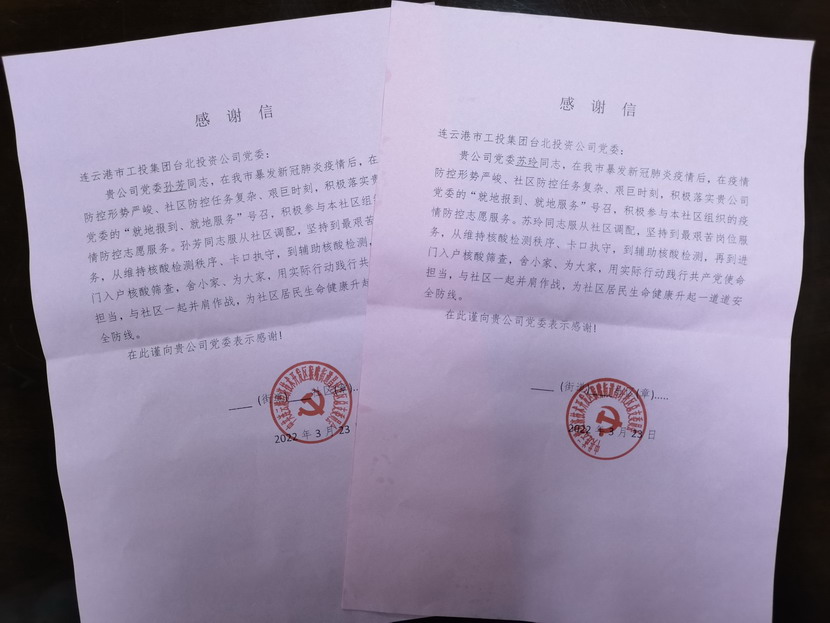 隨后,公司又接連收到海州區(qū)新東街道外倉社區(qū)、幸福路街道西大嶺社區(qū)通過郵寄、傳真等方式送過來的疫情防控感謝信。