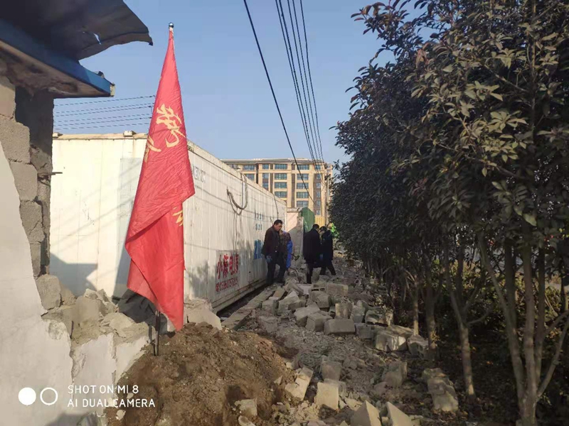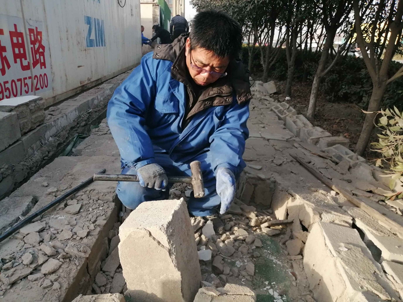 據(jù)悉,該處墻頭整體倒塌,大多數(shù)磚塊沒有受到損壞。志愿者們一塊一塊的挑選、清理、搬運,將可以回收利用的磚塊整理好,用于墻頭的修葺。水泥、沙的配比不太熟悉,天氣寒冷如何做好防凍,怎么辦?臨達公司的退休老黨員主動站了出來,為圍墻修葺工作做指導,提供幫助。經(jīng)過兩天的奮戰(zhàn),將倒塌的墻頭修葺好,并拉好了美化綠布。