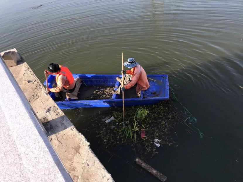 作業(yè)過程中,打撈人員因地制宜,采取分段清理、圍攔堵截、水上打撈等方式進行打撈,有的坐在船上用濾網(wǎng)、鉤耙等工具清理河面雜草,有的在岸邊將水草打撈上岸,并其進行集中處置,防止對河道造成二次污染。通過3個多小時的清理打撈,河道中的水流恢復暢通。