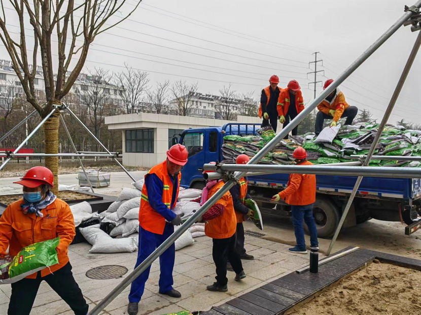 納福花境面積為126㎡,施工周期27日至31日,共5天。此次栽植前工作不同于以往,要先在底部鋪設(shè)排水板、土工布及2cm厚陶粒墊層,保證花箱底部透氣性及在降雨時能及時排出積水,再鋪設(shè)25cm厚黑泥土加20cm厚營養(yǎng)土拌5%沙,滿足植物的生長需要,完成栽植后在土壤上層鋪設(shè)2cm厚麥飯石。