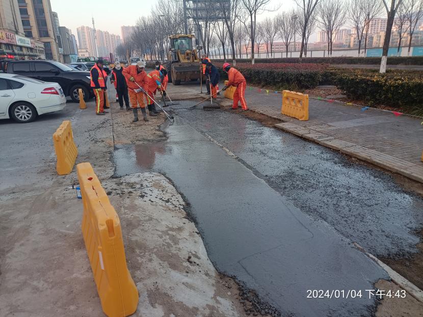 由于去年年底轄區(qū)平山路進(jìn)行電路改造,對道路路面及人行道道磚造成破壞,給行人帶來通行不便和安全隱患,為此,盛達(dá)市政公司為及時恢復(fù)行人安全出行環(huán)境,對平山路開展整治工作。整治工作中,該公司根據(jù)工作實(shí)際情況,科學(xué)安排,精心部署,始終嚴(yán)把質(zhì)量關(guān),和天氣比賽,與時間賽跑,在供電部門完成電路改造后,第一時間進(jìn)行破損路面清除、廢舊道磚拆除、布設(shè)圍擋等清障保通工作,于今年一月初進(jìn)行測量放線、混凝土澆筑、道磚鋪設(shè)等工作,通過養(yǎng)護(hù)人員20余天的有序作業(yè),順利完成整治工作,并做好灑水覆蓋養(yǎng)護(hù)。
