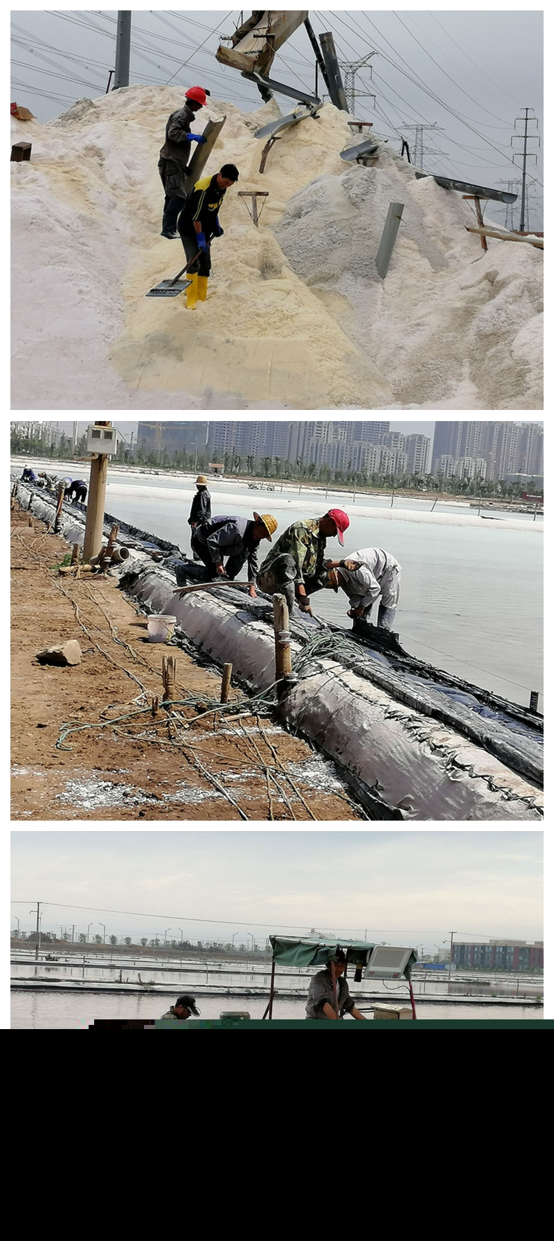 沒(méi)有參加扒鹽的人員也沒(méi)閑著,他們將工作重心轉(zhuǎn)移到苫布保鹽工作中來(lái),苫鹽廩布、整理樁繩、修補(bǔ)、拉放塑布,對(duì)存鹽廩基等區(qū)域進(jìn)行疏通加固,以及扒鹽后有序推進(jìn)灘場(chǎng)文明等等。特別是東灘,為了盡早完成1680公畝的灌池任務(wù),至三月初以來(lái),工人們起早貪黑、放棄節(jié)假日克服一切困難,經(jīng)過(guò)多方共同努力現(xiàn)已灌池1200多公畝,預(yù)估池內(nèi)長(zhǎng)鹽已達(dá)8000多噸。面對(duì)雨季即將到來(lái)之際,各單元在保證鹽色、鹽質(zhì)做好安全扒鹽的同時(shí),抓住晴好天氣強(qiáng)化大面積制鹵,加大走水深度和節(jié)制,充分利用蒸發(fā)量多制鹵、制好鹵為順利度過(guò)汛期做好一切準(zhǔn)備。