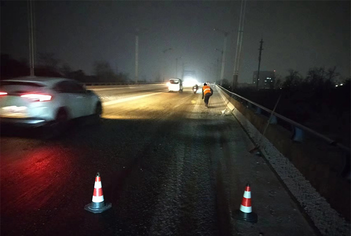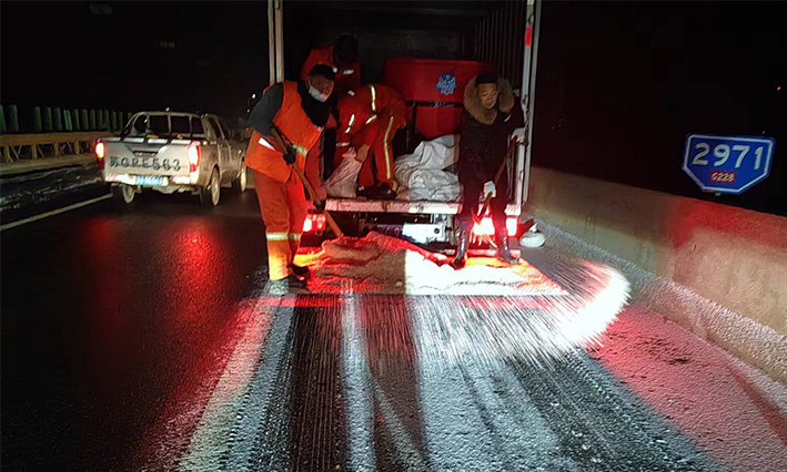 該公司除雪突擊隊由總經(jīng)理徐習華和副總王利分頭帶隊指揮,集結了安全部、管養(yǎng)部、綠化、保潔、市政、環(huán)衛(wèi)的突擊隊員80余名,出動5輛皮卡車、3輛皮卡、1臺裝載機和2輛巡查車,主要負責新區(qū)內橋梁、連云開發(fā)區(qū)橋梁、徐新路、疏港大道、228省道等主要交通干道布撒融雪劑抗凍救災工作。突擊隊員在進行融雪劑撒布作業(yè)的同時,及時清理路面融化雪水,防止再次結冰,各除雪設備配合作業(yè),階梯式向前推進,提高除雪效率。(李敏 王宜全)